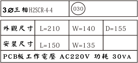 | 三相HSCR機(jī)型 | HSCR-4-4-030P | 30A | 210 | 140 | 152 | 150 | 140 | 10KW | 18KW | M6 | 50kgfcm | 自然冷卻 |