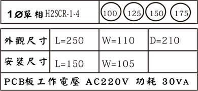 | 單相HSCR機(jī)型 | HSCR-1-4-030P | 30A | 210 | 110 | 210 | 150 | 110 | 6KW | 9KW | M5 | 50kgfcm | 自然冷卻 |