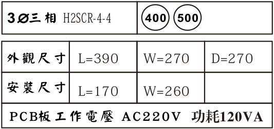 | 三相HSCR機(jī)型 | HSCR-4-4-030P | 30A | 210 | 140 | 152 | 150 | 140 | 10KW | 18KW | M6 | 50kgfcm | 自然冷卻 |