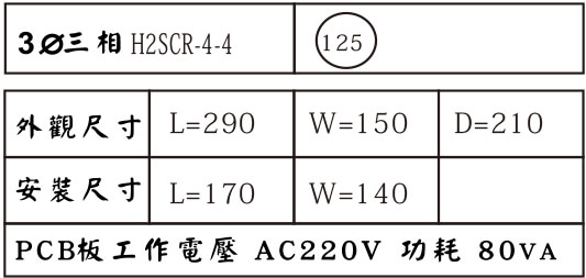 | 三相HSCR機(jī)型 | HSCR-4-4-030P | 30A | 210 | 140 | 152 | 150 | 140 | 10KW | 18KW | M6 | 50kgfcm | 自然冷卻 |