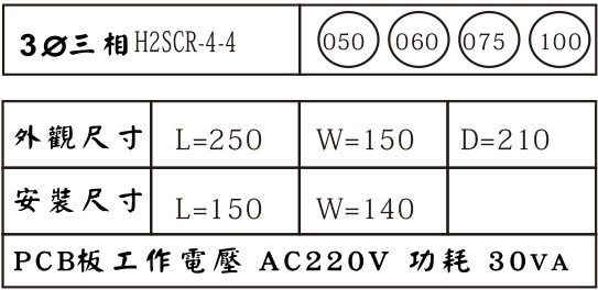 | H2SCR-4-4-030P | 30A | 210 | 140 | 152 | 150 | 140 | 10KW | 18KW | M6 | 50kgfcm | 自然冷卻 | |